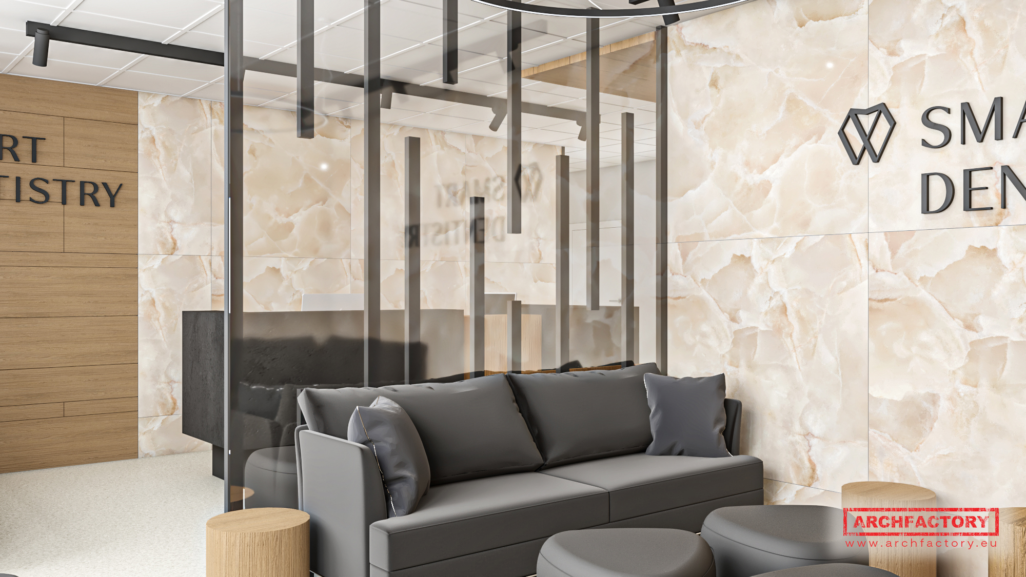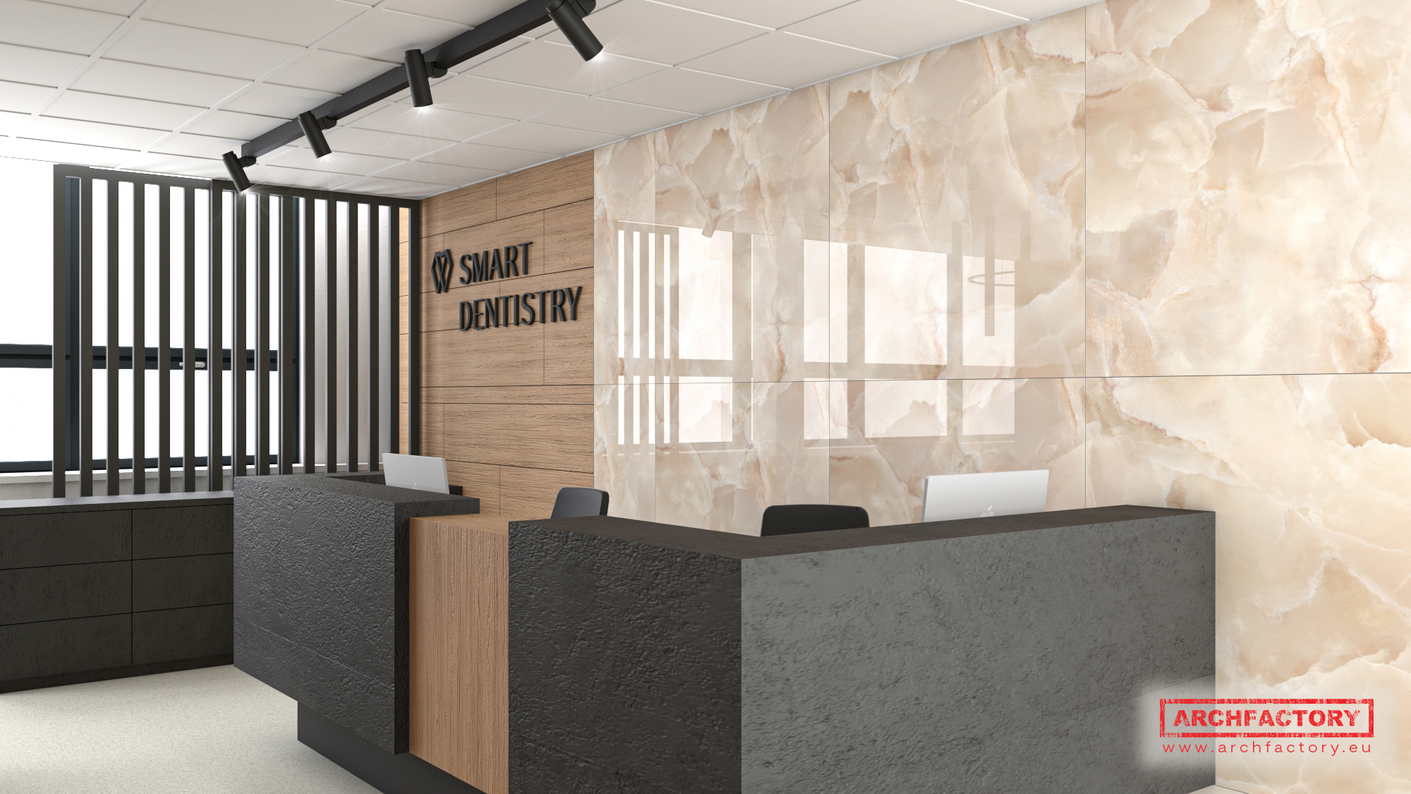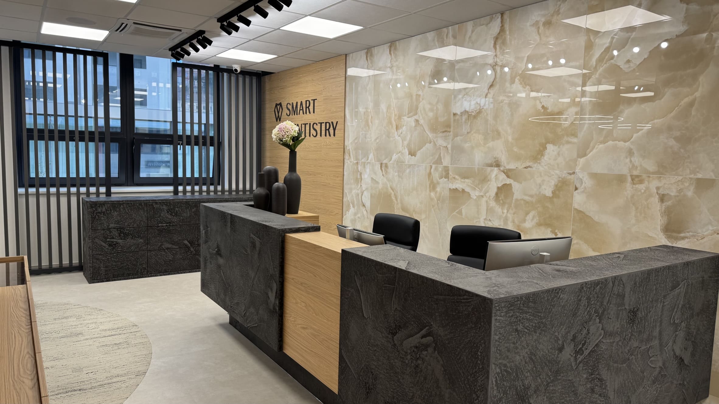 Hlavním prostorem projektu byla recepce a čekárna, kde jsme se zaměřili na vytvoření elegantního, ale přívětivého prostředí, které odpovídá vysokým standardům značky Smart Dentistry. Dominantním vizuálním prvkem je kombinace tří materiálů – teplý dekor dubového dřeva, výrazný béžový onyx na obkladových plochách a kontrastní tmavě šedý beton použitý v nábytkových prvcích.